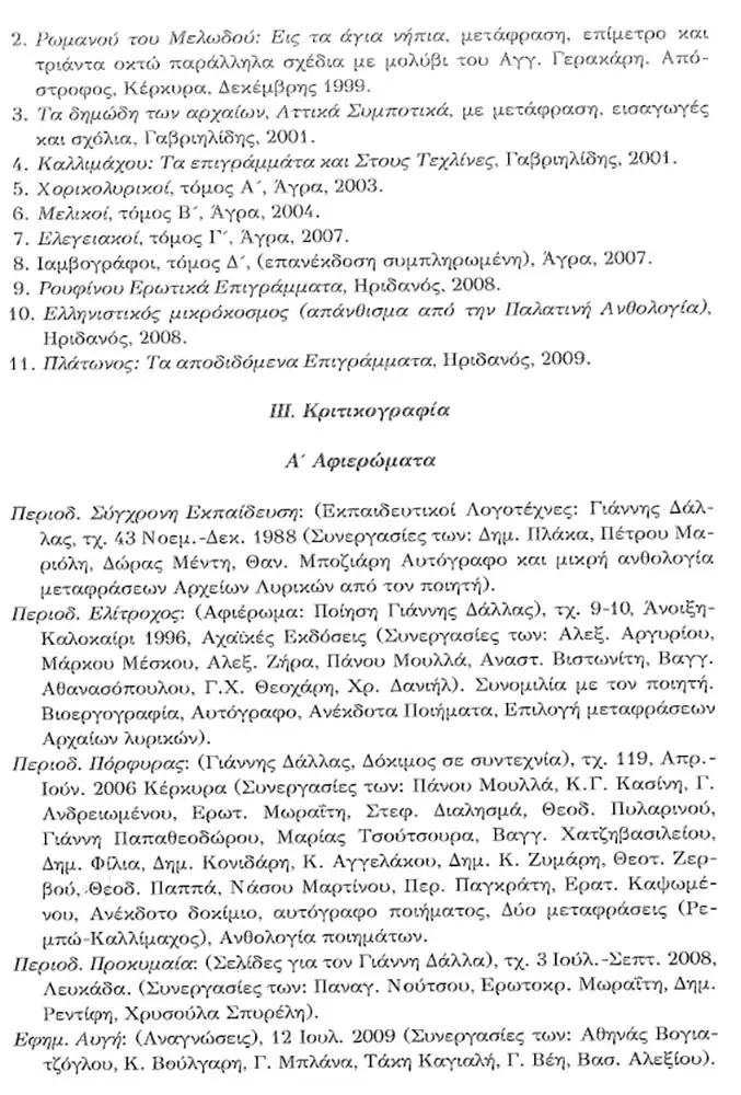 Στις φιλολογικές του εργασίες συγκαταλέγονται: κριτικές μονογραφίες για την ποίηση και την ποιητική του Σολωμού, του Κάλβου, του Καβάφη, μελετήματα για τα έργα συγγραφέων της γενιάς του ΄10 (Βάρναλη, Σικελιανού και Θεοτόκη), της γενιάς του ΄20 ( Καρυωτάκη, Άγρα και Φιλύρα ), των μοντέρνων του ΄30 ( Σεφέρη, Ελύτη, Ρίτσου, Εμπειρίκου και Εγγονόπουλου ) και αρκετών μεταπολεμικών ( π.χ. Ο ποιητής Μίλτος Σαχτούρης, «Κέδρος» 1977, Ο Μανόλης Αναγνωστάκης-Ποίηση και ιδεολογία «Κέδρος» 2007 ).